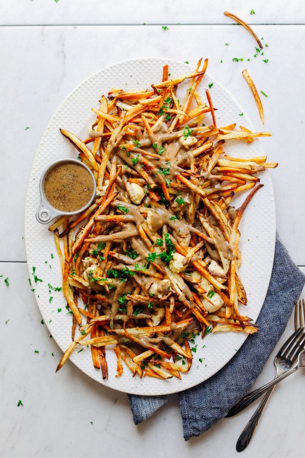 Vegan poutine with crispy potatoes, savory mushroom gravy, and melty vegan cheese curds! The perfect plant-based alternative to this Canadian classic.